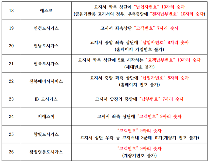 도시가스를 이용하시는 분들께서는 고객식별번호를 통해 가스 사용량을 확인하여 캐시백 신청이 가능합니다. 그러나 각 도시가스 회사마다 사용하는 명칭이 다를 수 있으니 아래의 내용을 확인해주시기 바랍니다.
