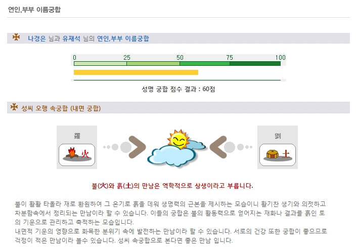 남녀의 이름으로 알아보는 현대식 이름궁합 사이트입니다. 이 사이트에서도 별도의 로그인 절차 없이 무료로 이용 가능합니다.