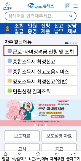 2. 홈택스 메인 화면에 "근로·자녀장려금 신청 및 조회"를 눌러줍니다.