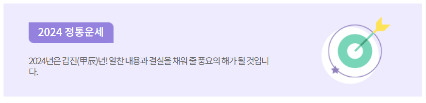 결과 페이지에서 2024년의 주요 운세 키워드를 확인합니다. 키워드는 해당 연도에 주의할 사항을 안내하는 가이드라인입니다.