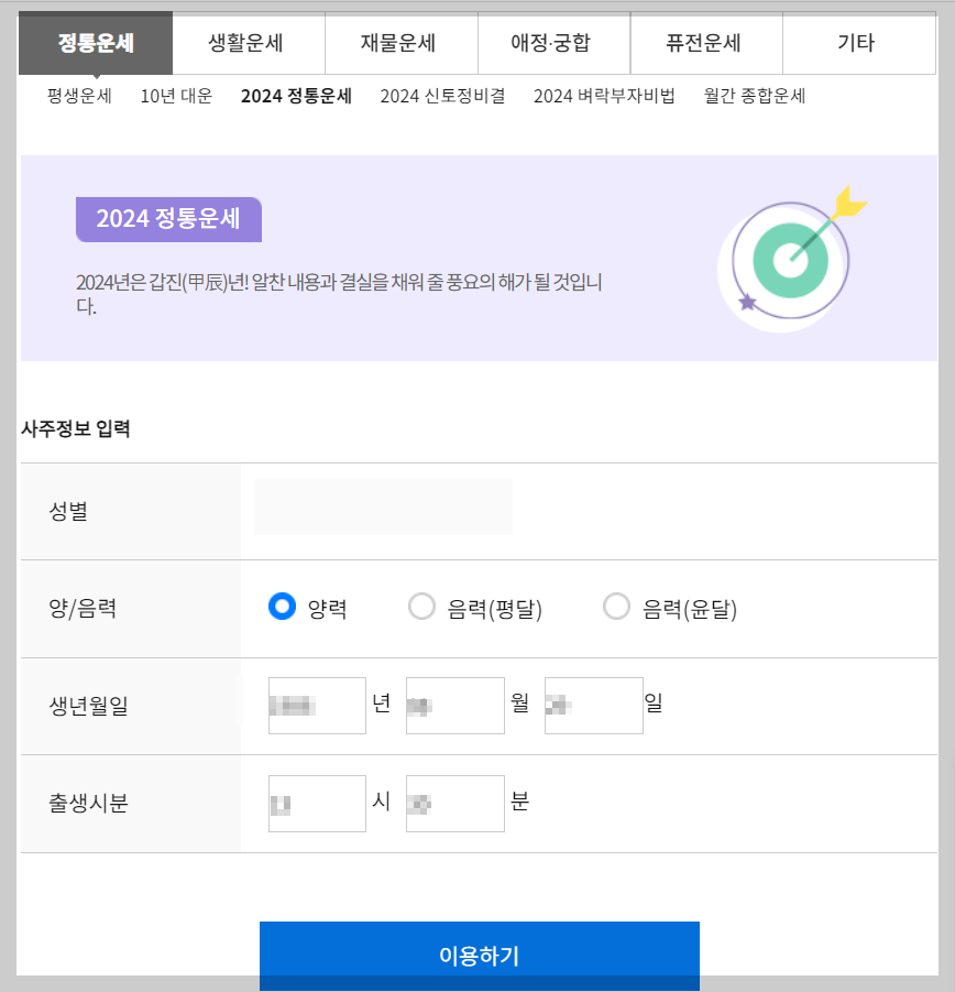 생년월일, 출생 시간 등 필요한 사주 정보를 입력 후, '이용하기' 버튼을 클릭하여 운세를 확인합니다.