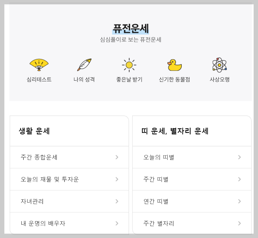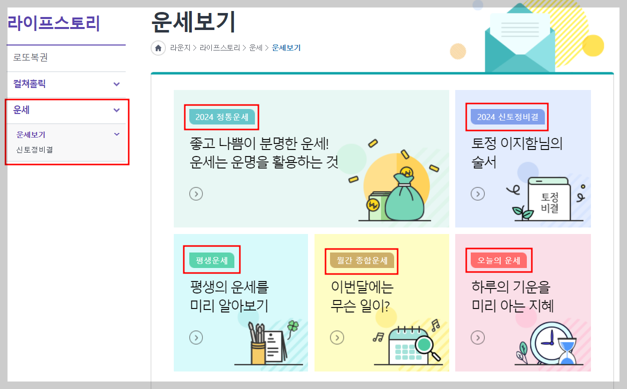 운세 페이지에서 다양한 운세 카테고리를 확인할 수 있습니다. 2024 정통운세를 클릭해 봅니다.